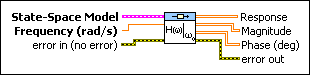 Determines the magnitude and phase of the system at the given frequency. Wire data to the State-Space Model input to determine the polymorphic instance to use or manually select the instance.