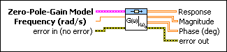 Zero-Pole-Gain Model contains a mathematical representation of and information about the system for which this VI determines frequency response. |