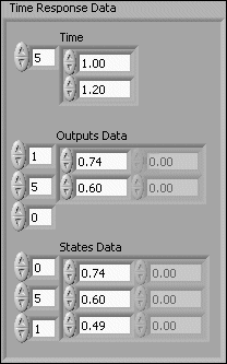 Response Data returns a matrix that provides the time response data for all the input-output pairs you select. The first element in the matrix is the response to the first input and first output. The second element is the response to the first input and second output. After listing all input-output pairs this VI associates with the first input, the matrix lists the input-output pairs that this VI associates with the second input, then third input, and so on until the matrix lists all responses. | ||||||