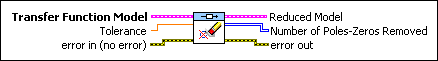 For transfer function models, this VI searches for the closest zero to each pole of the dynamic system. If the closest zero is within the threshold that the Tolerance specifies, this VI removes the zero-pole pair and reduces the system order.