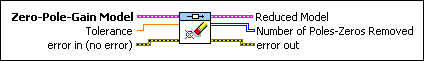 For zero-pole-gain models, this VI searches for the closest zero to each pole of the dynamic system. If the closest zero is within the threshold the Tolerance specifies, this VI removes the zero-pole pair and reduces the system order.