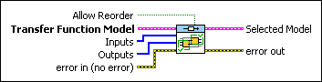 Transfer Function Model contains a mathematical representation of and information about the system in which this VI keeps the inputs and/or outputs in the resulting model. | ||||||||||||||