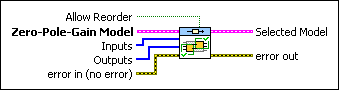 Zero-Pole-Gain Model contains a mathematical representation of and information about the system in which this VI keeps the inputs and/or outputs in the resulting model. | ||||||||||||||