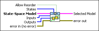 ![]() | Note If you specify a value of [–1] for the States, Inputs, or Outputs parameter, this VI selects all model states/inputs/outputs, respectively. |