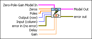 Output (row) specifies the output, or row, number of the transfer function (in zero-pole-gain form) in which this VI returns data. This number is necessary when the model represents a MIMO system. The index is zero-based. The default value is zero. |