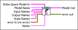 Sets the various names this VI associates with the inputs, outputs, and, if applicable, states of the model. Wire data to the State-Space Model In input to determine the polymorphic instance to use or manually select the instance.