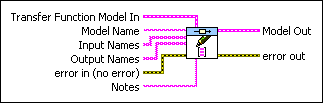 Transfer Function Model In contains a mathematical representation of and information about the system for which this VI sets inputs, outputs, and other names. |