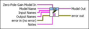 Zero-Pole-Gain Model In contains a mathematical representation of and information about the system for which this VI sets inputs, outputs, and other names. |
