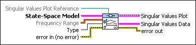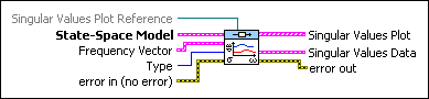 Singular Values Plot Reference is a reference to the Singular Values Plot. Singular Values Plot Reference configures the x-scale, y-scale, and legend properties. If you want to use the default settings or customize the settings for these properties, do not wire a value to this input. | ||||||||