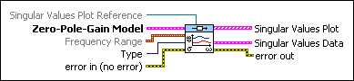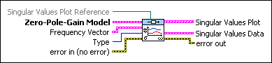 Zero-Pole-Gain Model contains a mathematical representation of and information about the system for which this VI determines the frequency response singular values. | ||||||||||||