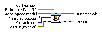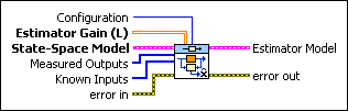 Builds the state estimator based on a list of known inputs, measured outputs, the linear state-space model, and the estimator gain. Wire data to the Estimator Gain (L) input to determine the polymorphic instance to use or manually select the instance.