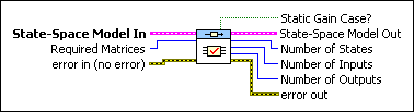 State-Space Model Out returns the model after this VI verifies dimensions and specification requirements. To access and modify the data in the model, use the Model Information VIs. | ||||||||||||||||||||||||||||||||