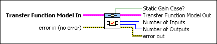 Transfer Function Model Out is the resulting model after this VI verifies dimensions and specification requirements. To access and modify the data in the model, use the Model Information VIs. |