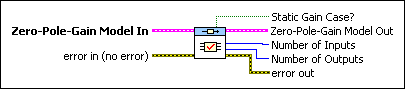 Zero-Pole-Gain Model Out is the resulting model after this VI verifies dimensions and specification requirements. To access and modify the data in the model, use the Model Information VIs. |