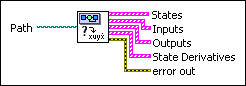 Returns the names and values of the parameters of the states, inputs, outputs, and state derivatives of a simulation subsystem. Use these parameters with the SIM Set Parameter Value VI to specify conditions and values that the SIM Trim VI and the SIM Linearize VI use. Wire data to the Path input determines the polymorphic instance to use or manually select the instance.