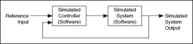 An offline simulation is one that is not connected to any hardware. You use the LabVIEW Control Design and Simulation Module to simulate all parts of the dynamic system, including the controller, the system you want to control, and any inputs or outputs. The following illustration represents a simulation of an offline control system.