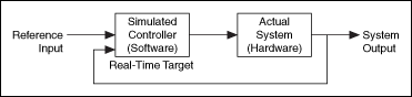 An RCP configuration replaces the simulated system with an actual system. Use this configuration to test multiple controller algorithms without building the controller again every time you make a change. In this situation, the simulated controller is connected to hardware actuators and hardware sensors. To convert an offline simulation to an RCP configuration, remove the system model from the simulation. Replace the system input with an output from a hardware device, and replace the system output with an input from a hardware device.