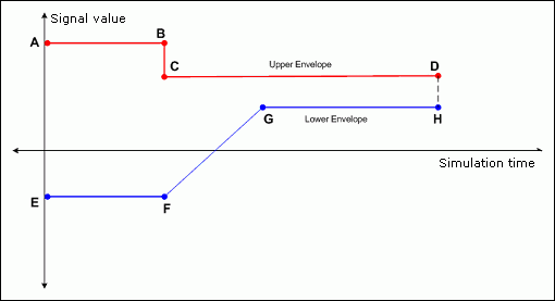 These envelopes are piecewise linear curves that specify the upper and lower limits on a signal during the simulation. The SIM Optimal Design VI then calculates H(p) as the minimum and maximum distance of the time series points from these envelopes.