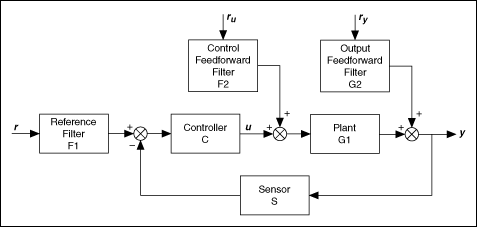 F1, F2, C, G1, G2, and S consist of transfer functions and associated information, such as delays and sampling time. You can use the SIM Construct Default System VI to construct these transfer functions and specify reference input signals R, Ru, and Ry. This VI returns the necessary dynamic system information in the System Data output, which you then can wire to the System Data input of the SIM Optimal Design VI. The SIM Optimal Design VI then excites the system using the defined inputs and obtains the time response.
