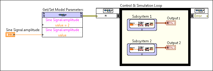 You can use the Access Model Hierarchy function to access model parameters in other VIs, including VIs that run on RT targets. The configuration dialog box for the function allows you to manually identify parameters you want to access in a different VI on the local computer. You also can write code similar to the following block diagram to identify the simulation VI and parameters programmatically.