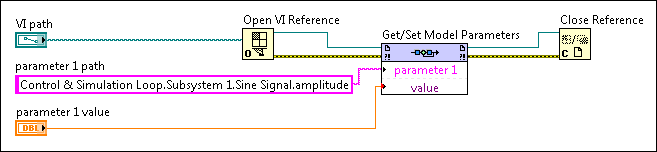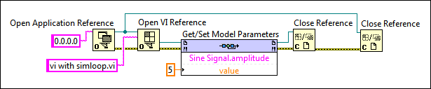The following block diagram shows an example of opening a reference to an RT VI that contains a simulation diagram and writing a value to a model parameter.