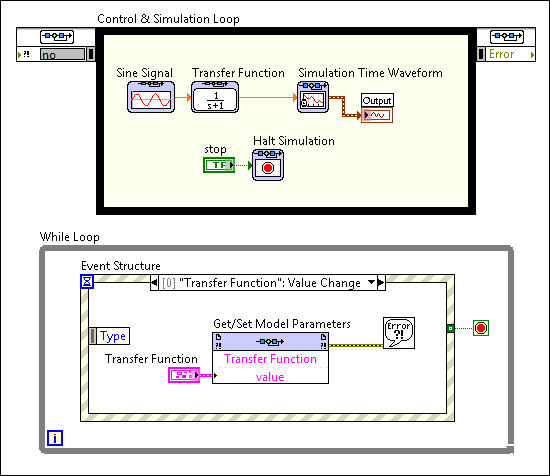You also can use the Access Model Hierarchy function to change model parameters of functions and subsystems at run time. The following block diagram allows users to update the equation that the Transfer Function function implements while the VI runs. Users change the coefficients in the Transfer Function control and the Access Model Hierarchy function updates that parameter.