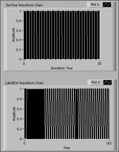 Notice the irregularities in the LabVIEW Waveform Chart when compared to the SimTime Waveform Chart.