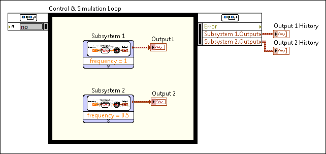 When the following block diagram runs, the subsystems return scalar waveforms as the simulation executes. When the simulation finishes, the Output Node of the Control & Simulation Loop returns arrays of values stored from the signals you specify.