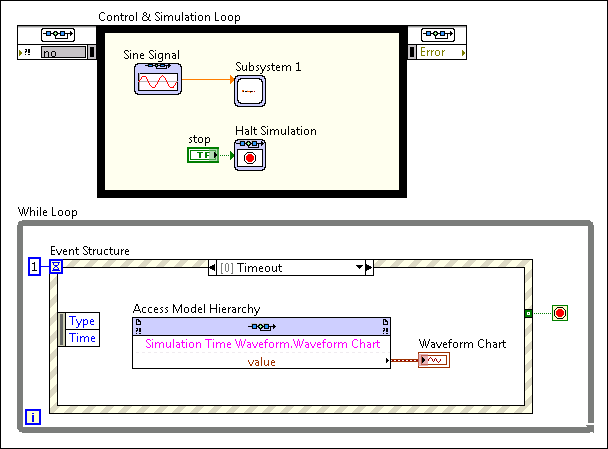 When the following block diagram runs, the Access Model Hierarchy function returns the signal values wired from the Waveform Chart output of a SimTime Waveform function in a subsystem.