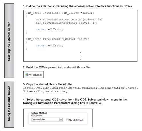 After you create the external solver in C/C++, build the C/C++ project into a .dll file and copy the shared library into the labview\vi.lib\Simulation\ContinuousLinear\Implementation\Shared\Solvers\Plugins directory. You then can select the external solver from the ODE Solver pull-down menu in the Configure Simulation Parameters dialog box to use the external solver in a simulation. Use the Information function to specify the name of the solver that appears in the ODE Solver pull-down menu.