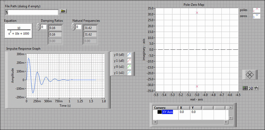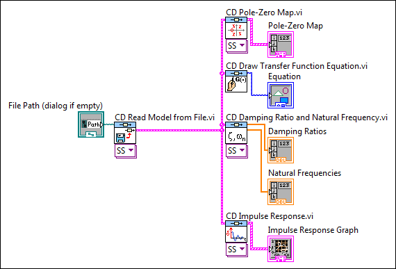 - Use the palette search to add a CD Pole-Zero Map VI, a CD Damping Ratio and Natural Frequency VI, and a CD Impulse Response VI to the block diagram.