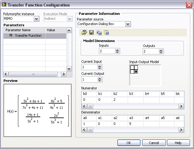 The following illustration shows a sample configuration dialog box for a MIMO transfer function model.