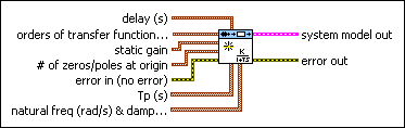 Creates a continuous transfer function model for a partially known system. Use the SI Estimate Partially Known Continuous Transfer Function Model VI to estimate the model you create with this VI. You must manually select the polymorphic instance to use.