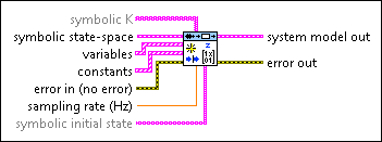 symbolic K is the symbolic representation of the Kalman gain. If symbolic K is not provided, the estimated state-space model contains only the deterministic part of the system. | ||||||||