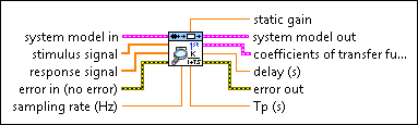 When estimating continuous transfer function models from array data, you must set the sampling rate for this VI to convert continuous systems to discrete systems. This VI then simulates the output and compares the simulated output with the response signal to optimize estimation.