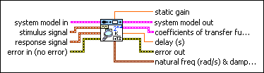 Estimates a continuous transfer function model for a partially known system. Use the SI Create Partially Known Continuous Transfer Function Model VI to create the model you want to estimate. You must manually select the polymorphic instance to use.