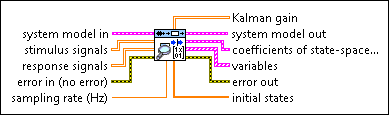 Estimates a state-space model for a partially known system. Use the SI Create Partially Known State-Space Model VI to create the model you want to estimate. Wire data to the stimulus signal and response signal inputs to determine the polymorphic instance to use or manually select the instance.