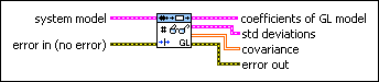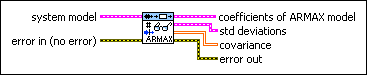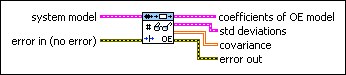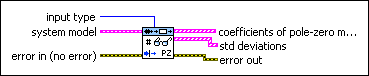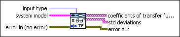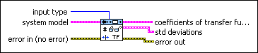 Returns the coefficients of system model and the standard deviation and covariance of the coefficients. Use the SI Set Coefficients to System Model VI to apply coefficients and the standard deviation and covariance of the coefficients to system model. You must manually select the polymorphic instance to use.