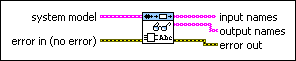 Reads input and output names from a system model. Use the SI Set Names to System Model VI to write input and output names to a system model.