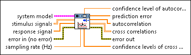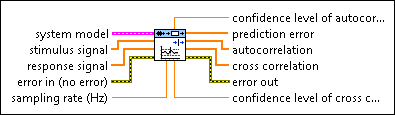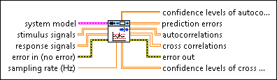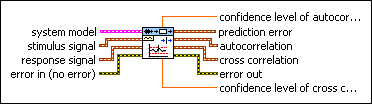 Computes and analyzes the prediction error for the response output of a model system. Wire data to the stimulus signal and response signal inputs to determine the polymorphic instance to use or manually select the instance.