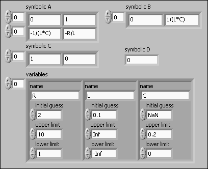 You also can use prior knowledge to define the initial guesses and upper and lower limits of R, L, and C. The SI Create Partially Known State-Space Model VI uses variables rather than numerical values to construct a symbolic model. As the following figure shows, you use variable names, such as R, L, and C, in the symbolic A, symbolic B, symbolic C, and symbolic D inputs to define the RLC circuit. Then you specify values for R, L, and C in the variables input.