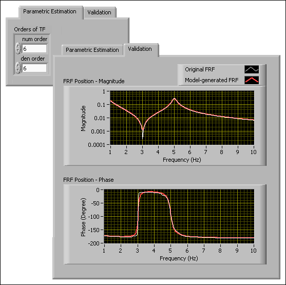 In this case study, setting the value of the Orders of TF to 6 provides a closer alignment of the Model-generated FRF and the Original FRF. Therefore, a 6th-order transfer function model describes the voltage-position FRF of the dynamic system more accurately than a 2nd-order model.