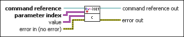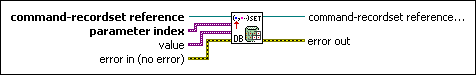 Sets the value of the parameter at parameter index in the command or command-recordset. The parameter index can be either the zero-indexed position of the parameter in the command or the name of the parameter. Wire data to the reference input to determine the polymorphic instance to use or manually select the instance.