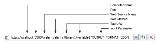 The following figure shows an example URL that a web client might use to exchange data with the Alarms & Events Web service, nialarm: