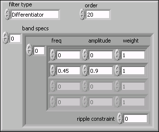 Use the DFD Remez Design VI to design a differentiator by setting the filter type input to Differentiator.