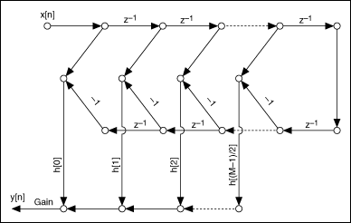 Use the FIR Antisymmetric structure for antisymmetric linear phase FIR filters, which use the antisymmetry of the filter coefficients to reduce the number of multipliers from M+1 to M/2, when M is an even number, or (M+1)/2, when M is an odd number. The following figure represents the FIR Antisymmetric structure when the filter order is an even number:
