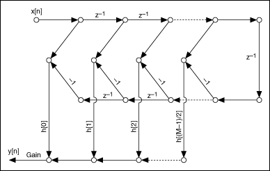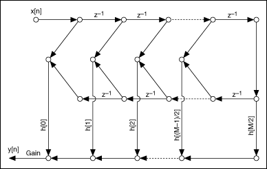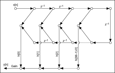 Use the FIR Symmetric structures for symmetric linear phase FIR filters, which use the symmetry of the filter coefficients to reduce the number of multipliers from M+1 to M/2+1, when M is an even number, or (M+1)/2, when M is an odd number. The following figure represents the FIR Symmetric structure when the filter order is an even number: