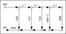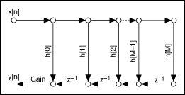 For FIR filters, the FIR Direct Form structure is the most straightforward structure from a filter transfer function perspective. The number of delays equals the filter order. Refer to the Understanding Filter Structure Graphs section for information that helps you read and understand a filter structure graph. The following figure represents the FIR Direct Form structure: