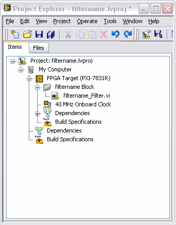 The LabVIEW Digital Filter Design Toolkit uses LabVIEW projects to manage the resulting LabVIEW FPGA code. The following figure shows an example project file that contains LabVIEW FPGA code: