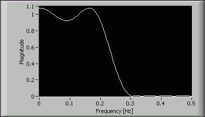 As an example for the second situation, suppose you want to design a lowpass filter with the same passband and stopband frequency ranges as the previous example. You can specify the ripple constraints for the passband and the stopband as 0.01 and 0.001, respectively, and set the minimum order input to minEven. The following figure shows the magnitude response of the 28th order equi-ripple FIR filter that the DFD Remez Design VI returns: